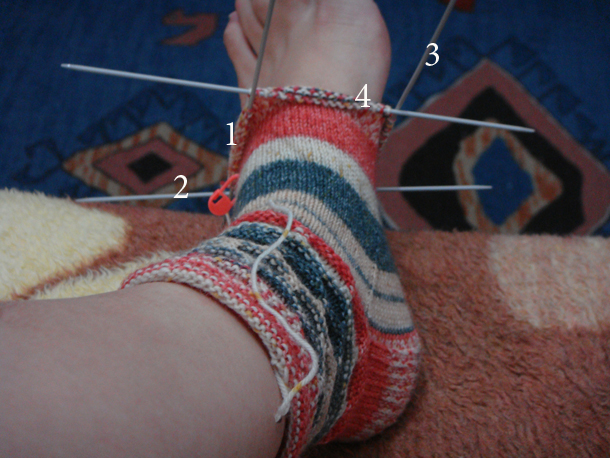 Σε αυτό το σημείο σας προτείνουμε να αφήσετε τους πόντους του πάνω τμήματος της κάλτσας έτσι όπως είναι στις δύο βελόνες. Για τους υπόλοιπους πόντους φροντίζουμε η αρχή του γύρου να είναι το κέντρο της πτέρνας και έτσι οι υπόλοιπες δύο βελόνες έχουν μισούς πόντους πτέρνας + πλαϊνούς η κάθε μια.