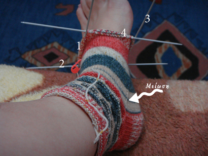 Ακολουθεί βίντεο με Σήκωμα πόντων στα πλαϊνά της κάλτσας, Μοίρασμα σε 4 βελόνες και Μείωση πόντων στα πλαϊνά