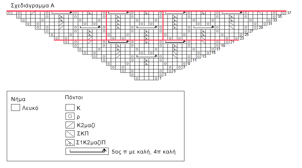 Το Σχεδιάγραμμα Α δείχνει την μισή εσάρπα, δεν δείχνει (δεν περιλαμβάνει) τον κεντρικό πόντο. Έτσι, όταν πλέκουμε το σχεδιάγραμμα Α πλέκουμε ως εξής: